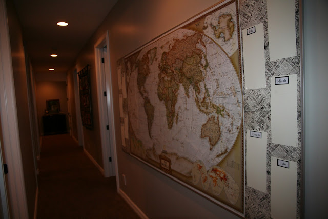 Must be a right of passage thing for an LDS Mom because I did the very same thing just before my oldest son got his mission call...I bought a huge map from National Geographic. It was on a beautiful board so all we had to do was hang it up. (we are not as creative as you) And then once the 4th son returned home I gave the map away.