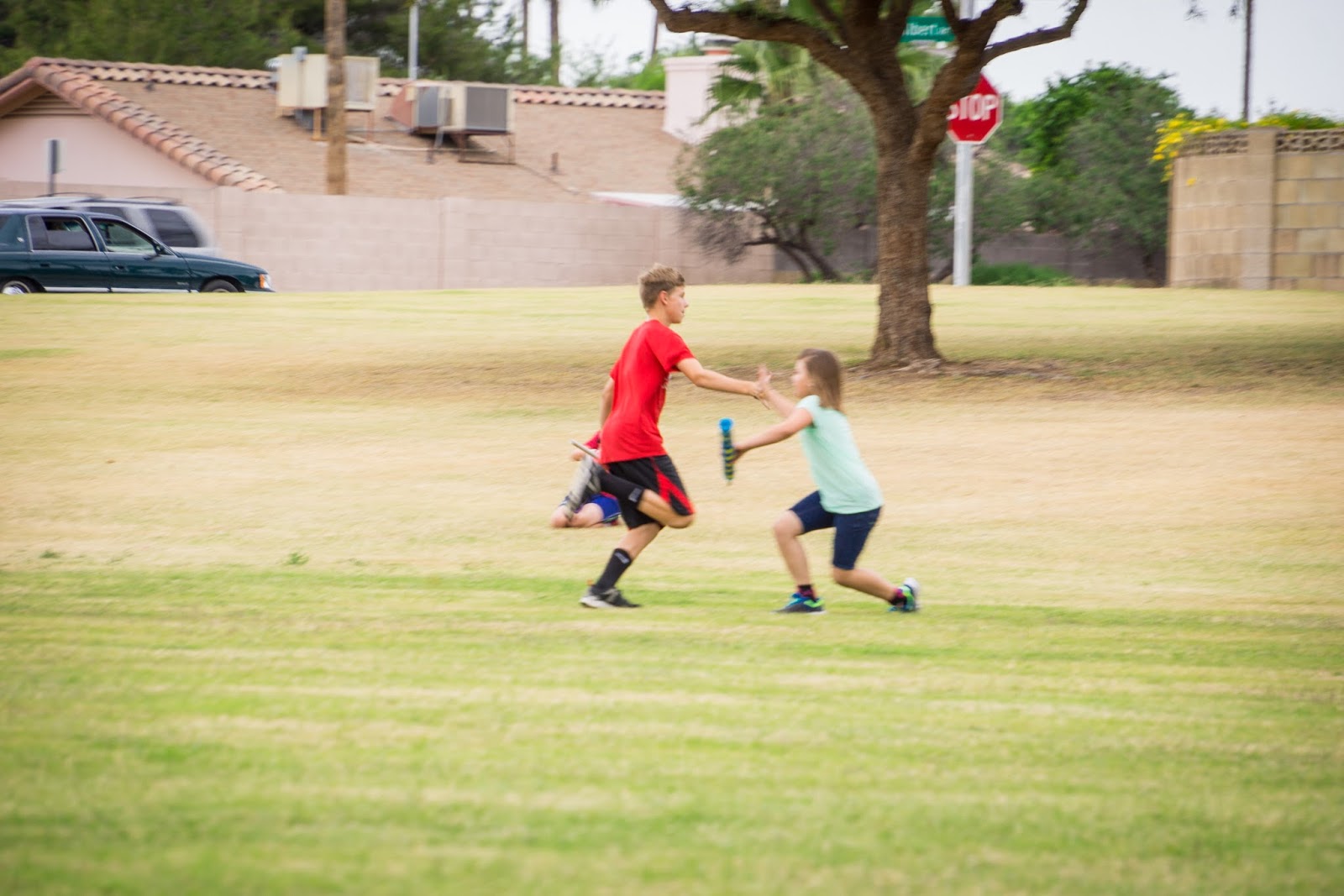 When I said, "GO!" both teams sprinted for their own weapon in the middle.