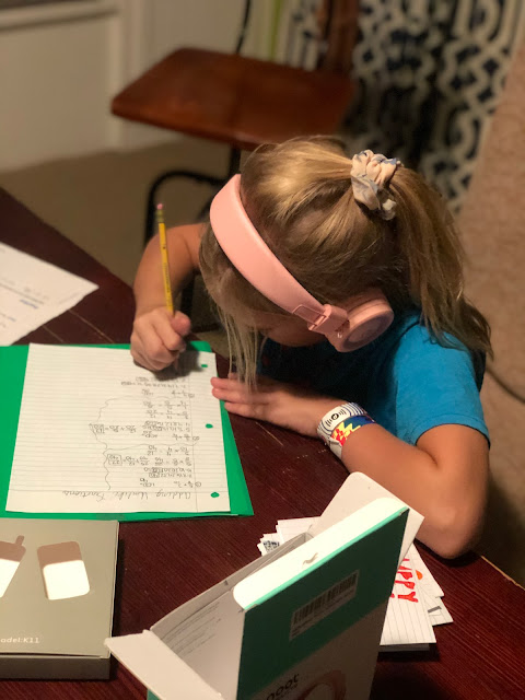 Even after she got home and had homework, she still enjoyed her birthday--wearing her new pink headphones although they weren't plugged into anything.