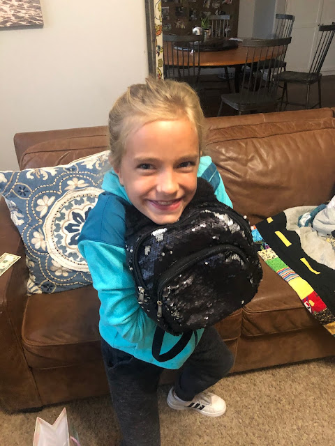 She was so happy for this big day. And a sequin-covered mini-backpack is just what she wanted!My Eve plays teacher all the time, talks about school and what she's going to teach "her kids," and even creates her own homework packets.